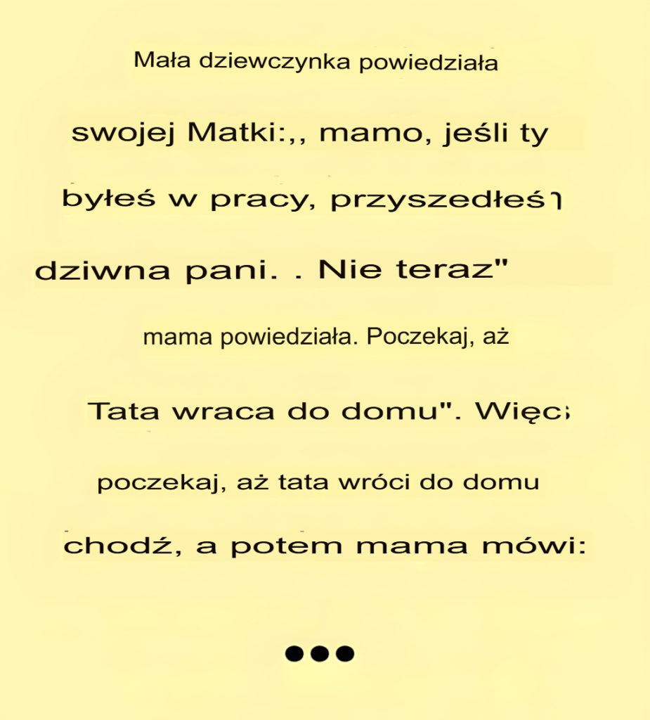 Mała dziewczynka siedzi przy stole, niewinnie bawiąc się łyżką, i spogląda na swoją mamę. „Mamo, kiedy byłaś w pracy, do domu przyszła jakaś dziwna pani.” Mama, zajęta rozpakowywaniem zakupów,