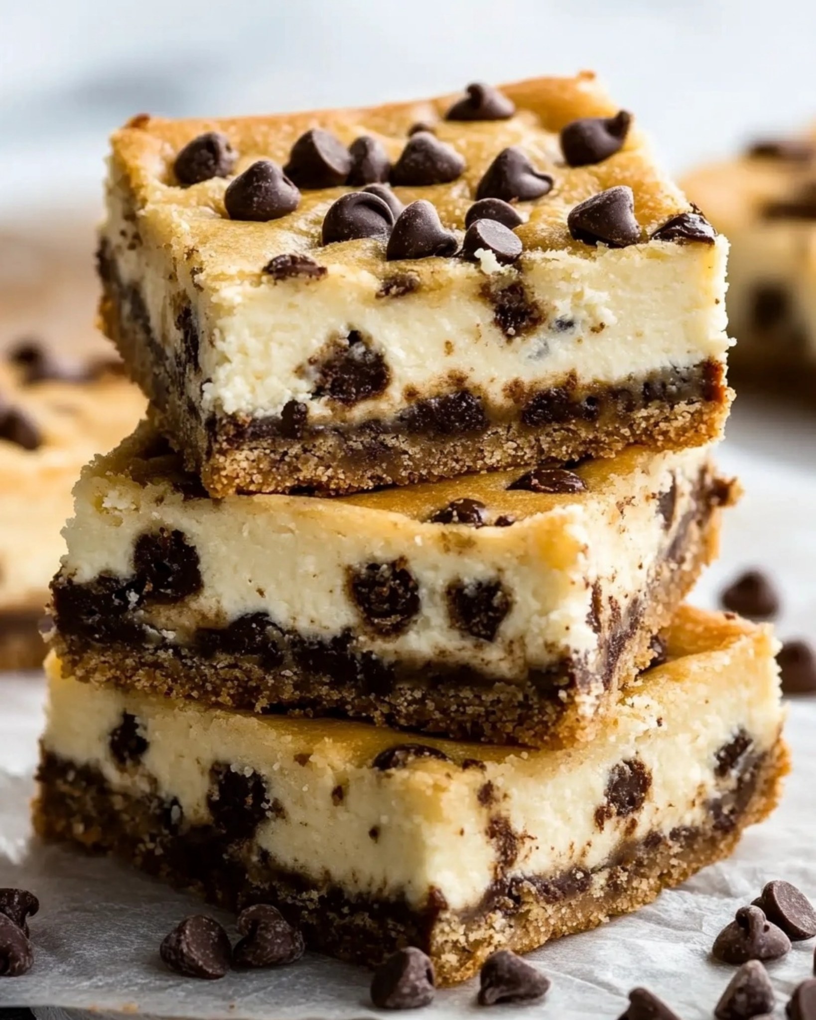 Te batony sernika z kawałkami czekolady łączą w sobie to, co najlepsze z obu światów: klasyczne ciasto z kawałkami czekolady z kremowym środkiem sernika, zwieńczone kolejną warstwą ciasta z kawałkami ciastek. Idealne dla miłośników deserów!