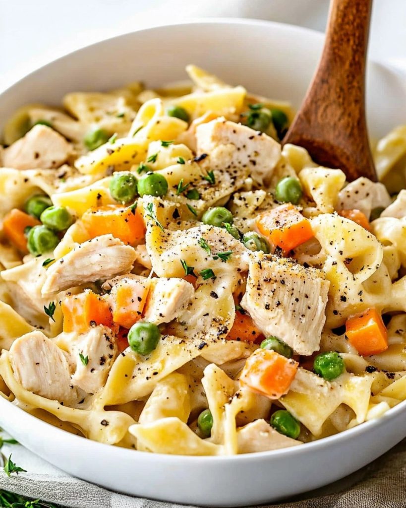 🌟 Kremowy makaron z kurczakiem – danie pocieszające 🌟 To danie bardzo przypomina mi moją babcię, która przyrządzała je w chłodne wieczory. Zapach kurczaka gotowanego z rozmarynem wypełnił dom i