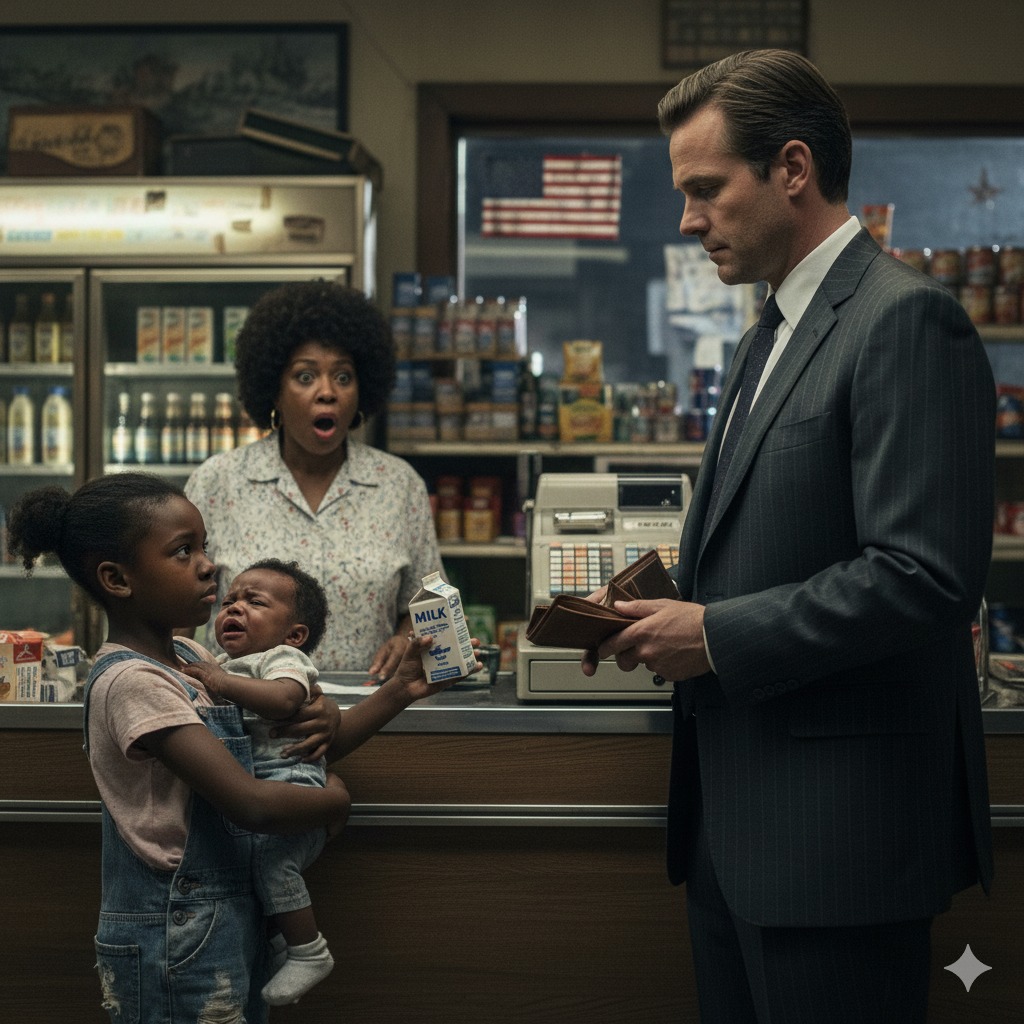 „Proszę pana… proszę. To dla mojego brata. Jest głodny” – rozpaczliwie wskazała na formułę. Przełknęła ślinę, wpatrując się w niego swoimi wielkimi, poważnymi oczami. „Mam tylko tego jednego dolara, ale… obiecuję, że odpłacę ci, kiedy dorosnę. Będę bogaty. Obiecuję ” .
