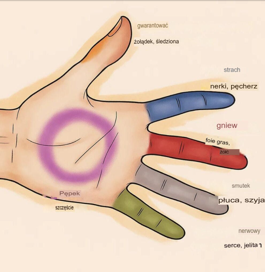 Podstawową ideą tej filozofii jest to, że każdy palec jest powiązany z konkretnym narządem i konkretną emocją. Jeśli zdecydujesz się na leczenie danego narządu, uciskaj odpowiedni punkt na dłoni przez 3 do 5 minut i spróbuj się zrelaksować.