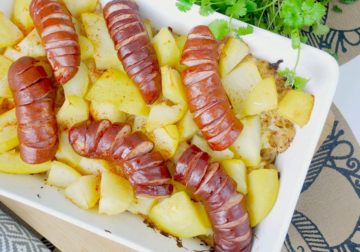 Kiełbasa zapiekana z kiszoną kapustą i ziemniakami to prosty przepis na smaczny i sycący obiad dla całej rodziny. Powstaje tylko z kilku tanich składników, które można kupić w każdym sklepie spożywczym, a do tego zachwyca smakiem. To danie idealne na chłodniejsze dni – sycące i rozgrzewające. Zapiekankę można dowolnie modyfikować, dodając np. ser, boczek lub ulubione przyprawy.