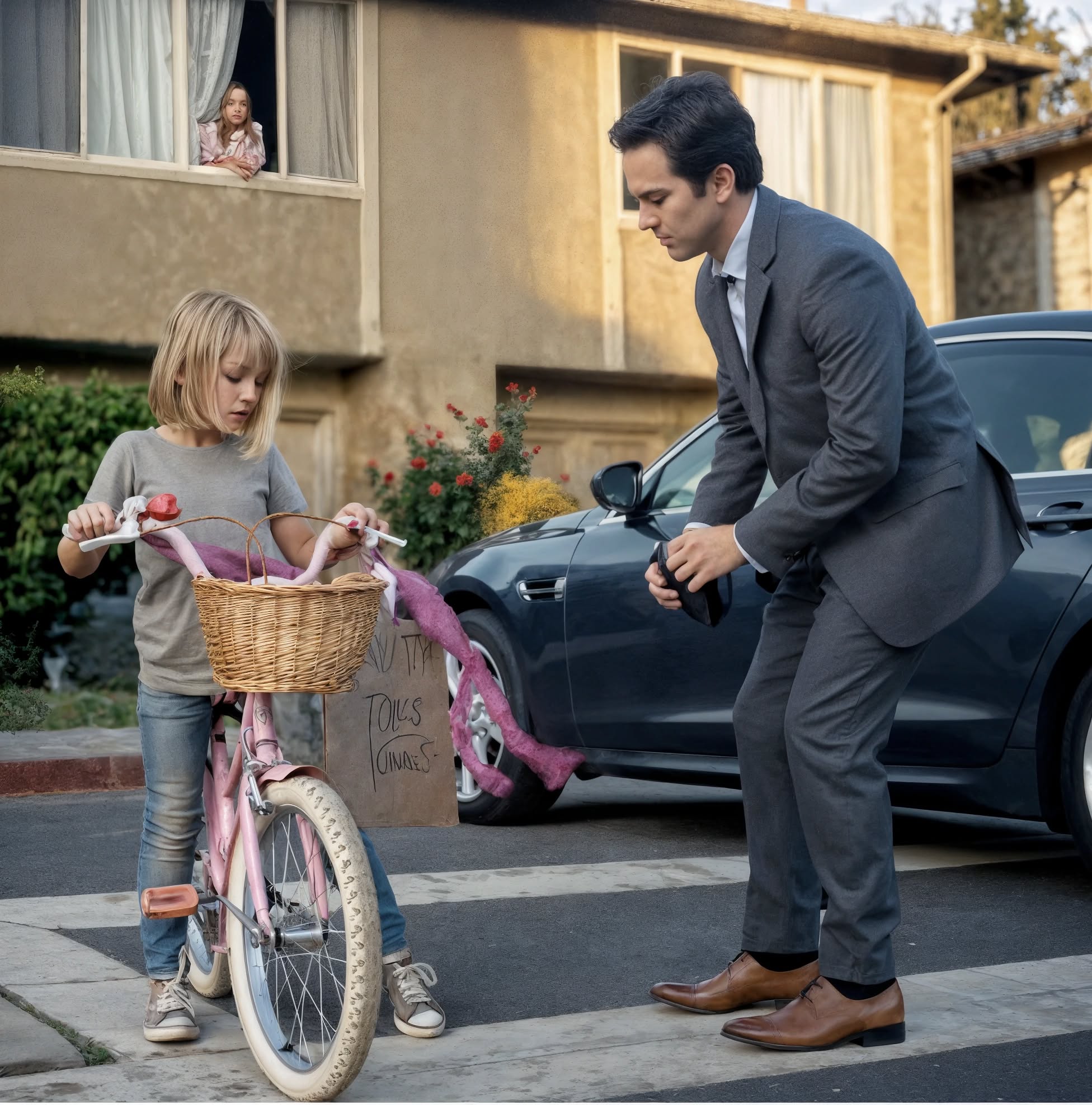Słowa te wyrwały się z ust siedmioletniej blondynki, której małe dłonie drżały, gdy trzymała ręcznie wykonany kartonowy transparent. Arthur Stribbling, prezes i milioner, zaparkował swoje luksusowe BMW po tym, jak zobaczył niewiarygodną scenę: dziecko sprzedawało swój różowy rower na rogu ulicy mieszkalnej w Fresno.