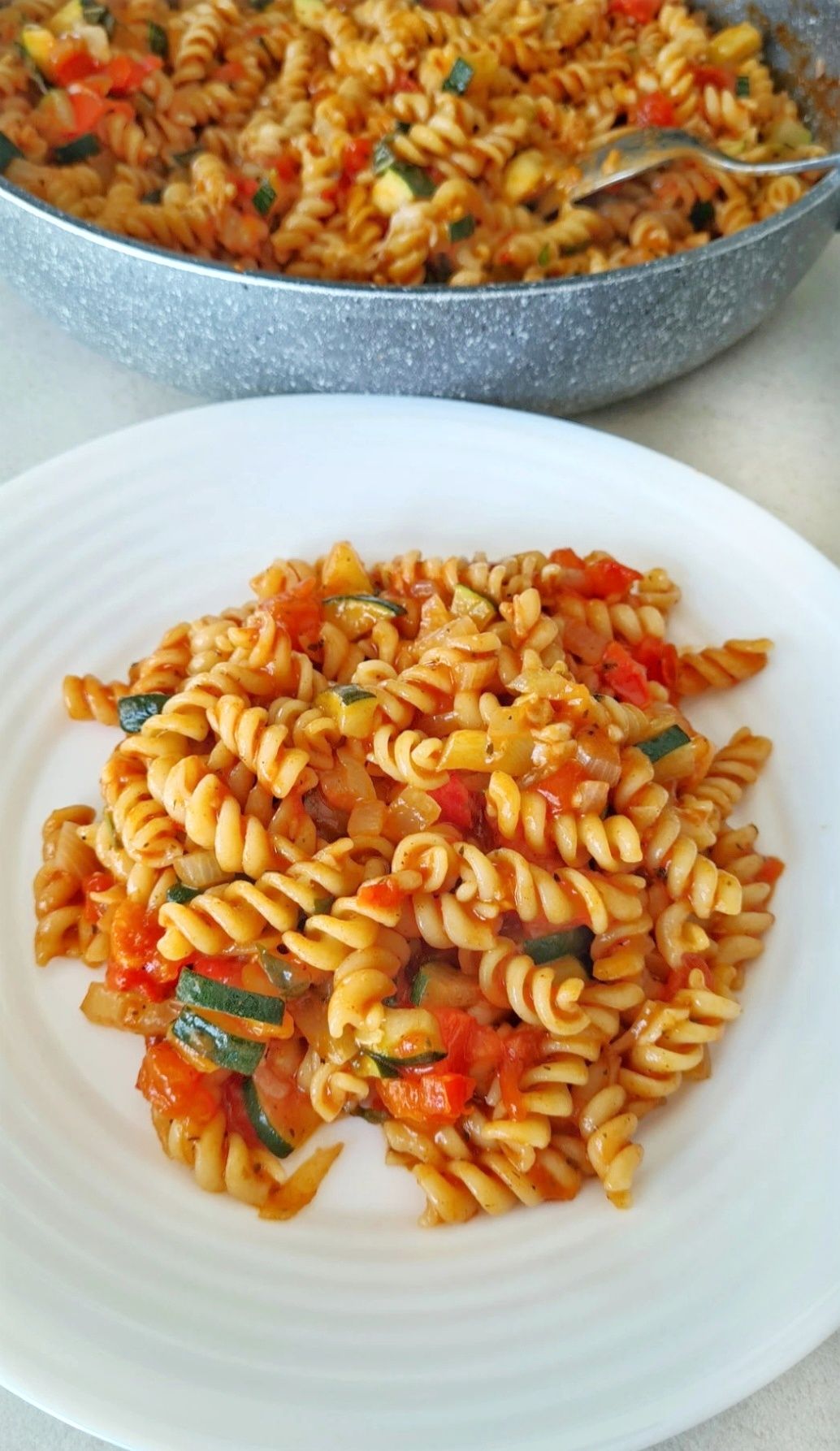 Na patelni rozgrzewam olej i następnie wrzucam pokrojoną drobno cebulę. Smażę 3-4 minuty, następnie dorzucam surowy makaron, drobno pokrojoną cukinię, pomidory i czosnek przeciśnięty przez praskę.