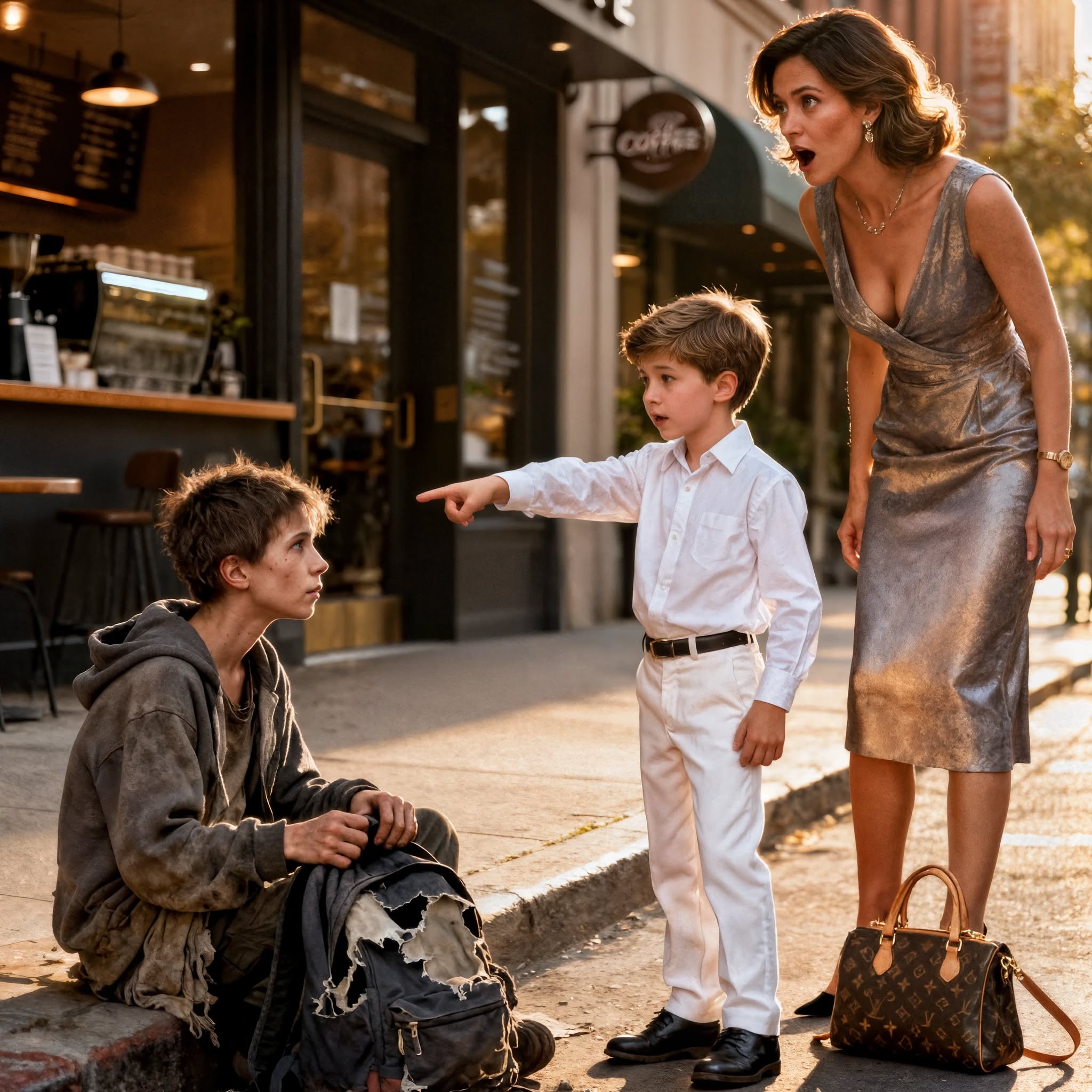 Po drugiej stronie ulicy, niedaleko rogu piekarni, mały chłopiec kulił się pod zepsutym parasolem. Jego ubranie było przemoczone, włosy splątane i posklejane. Jadł to, co zostało w wyrzuconym opakowaniu po kanapce. Pomimo brudu, coś w nim było dziwnie znajomego – te same głębokie brązowe oczy, ten sam dołeczek w brodzie, ten sam delikatny kształt ust.