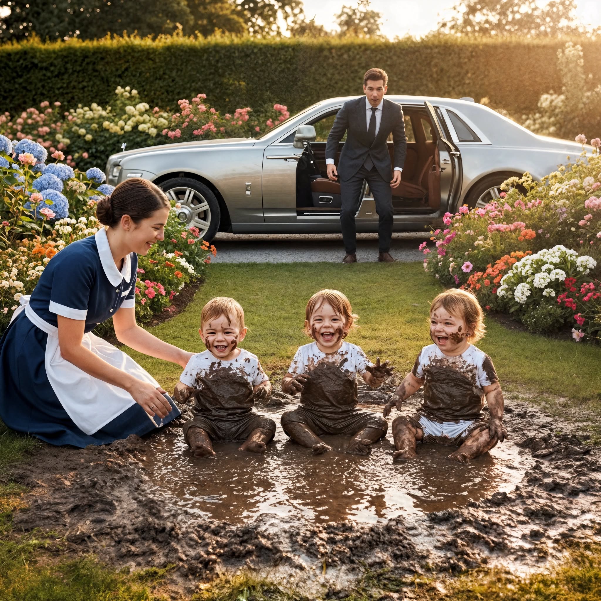 To nie był uprzejmy, formalny śmiech, lecz pełny, okrągły, ziemisty śmiech. Spojrzał w górę – i świat się zmienił. Troje dzieci, umazanych błotem, świętowało zwycięstwo w brązowej kałuży, rozpryskując wodę na idealnym trawniku. Obok nich, na kolanach, niania w niebieskim mundurku i białym fartuchu uśmiechała się, jakby była świadkiem cudu.