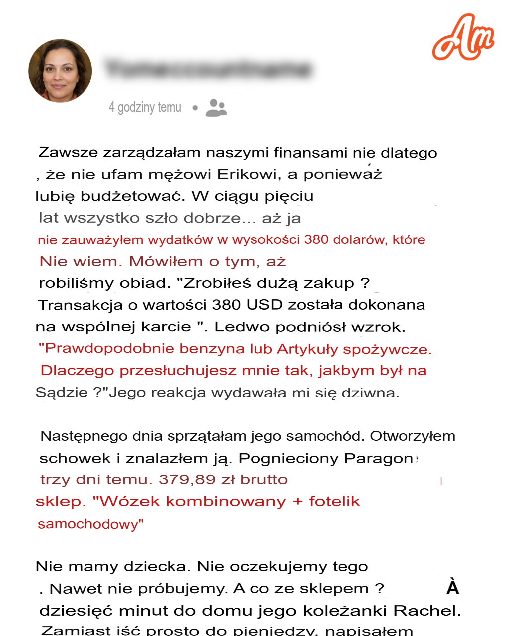 Budżetowanie to moja specjalność, dlatego śledzę każdą domową transakcję. Kiedy więc mąż zganił mnie za pytanie o jakiś wydatek, zaczęłam się interesować. Kiedy znalazłam w jego samochodzie paragon na 380 dolarów za wózek dziecięcy, przestałam zadawać pytania i zaczęłam łączyć fakty… bo nie mamy dziecka.