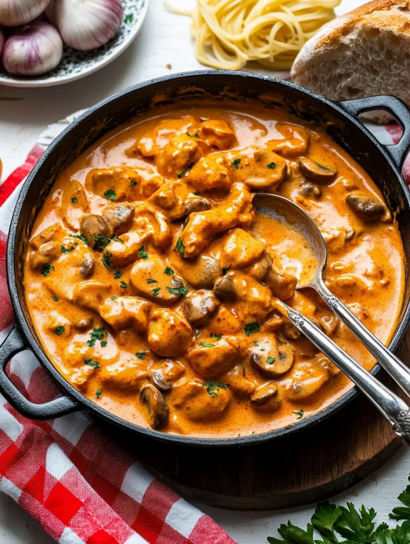 Chicken Stroganoff to sycąca wersja klasycznego Stroganoff, tradycyjnie przygotowywanego z wołowiny. Danie to jest bogate w smak dzięki kremowemu sosowi z grzybów i papryki, idealnemu z makaronem, ryżem lub ziemniakami. Składniki: – 500 g fileta z kurczaka, pokrojonego na kawałki – 250 g pieczarek, pokrojonych w plasterki – 1 cebula, drobno posiekana – 2 ząbki czosnku, drobno posiekane – 200 ml śmietanki kremówki – 100 ml bulionu z kurczaka – 2 łyżki musztardy – 1 łyżka papryki – 2 łyżki oliwy z oliwek – 1 łyżka mąki (do wiązania, opcjonalnie) – 1 łyżka świeżej pietruszki, posiekanej – Sól i pieprz z młynka🐔🍄🍽️