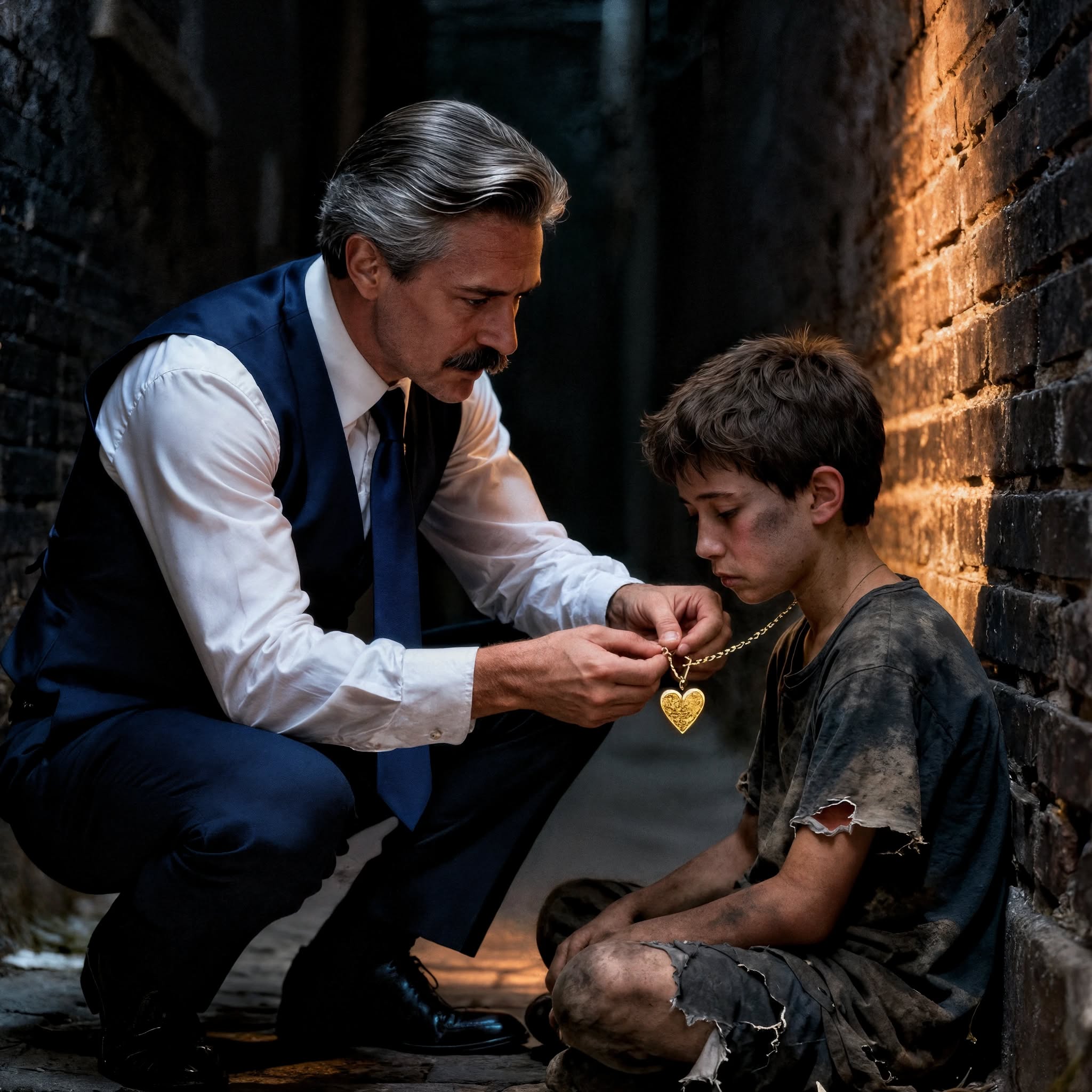 Pewnego mroźnego wieczoru, gdy przecinał alejkę za wieżą, by uniknąć dziennikarzy, coś go zmroziło. Tam, kucając przy śmietniku, stał mały chłopiec – bosy, przemoczony i drżący. Miał podarte ubranie i poobijane ręce. Edward mógł przejść obok, ale na szyi dziecka pojawił się błysk światła.