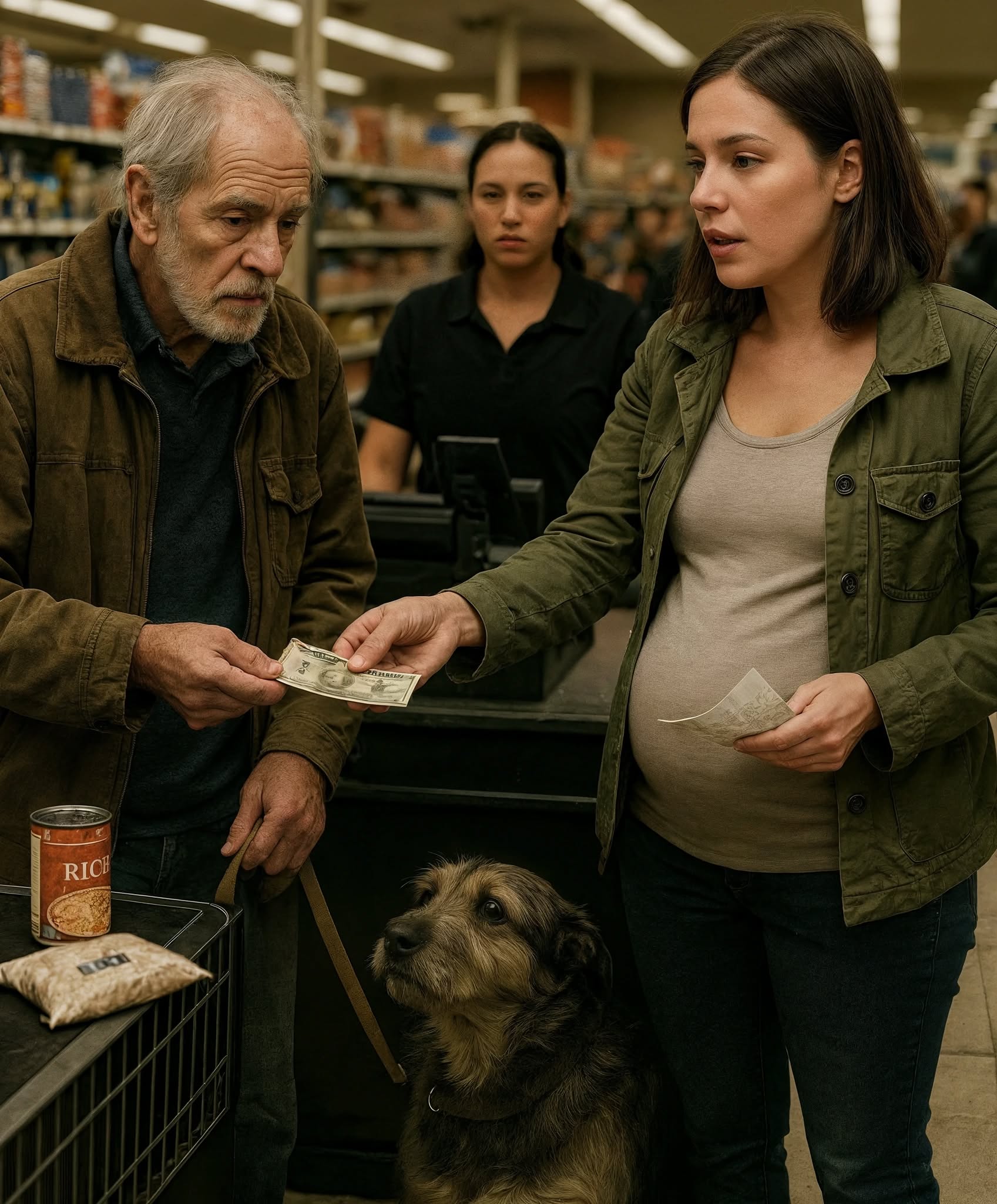 Byłam w siódmym miesiącu ciąży, bez grosza przy duszy i ledwo wiązałam koniec z końcem, gdy zobaczyłam go po raz pierwszy — starszego mężczyznę o zmęczonych oczach i zgarbionych ramionach, któremu towarzyszył kudłaty pies przyciskający się do jego nogi, jakby był jego jedyną kotwicą.