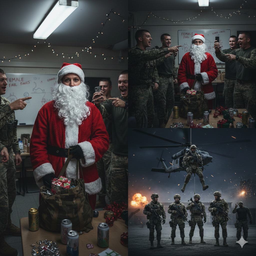 „To jest dla was dzisiaj »Pani Mikołajowa«!” – warknął, szczerząc zęby do swoich podwładnych. „I włóżcie w to trochę energii. Macie szczęście, że pozwoliliśmy wam zostać na bazie jako »cywilny konsultant«. Przynajmniej możecie pomóc w tej świątecznej atmosferze”.