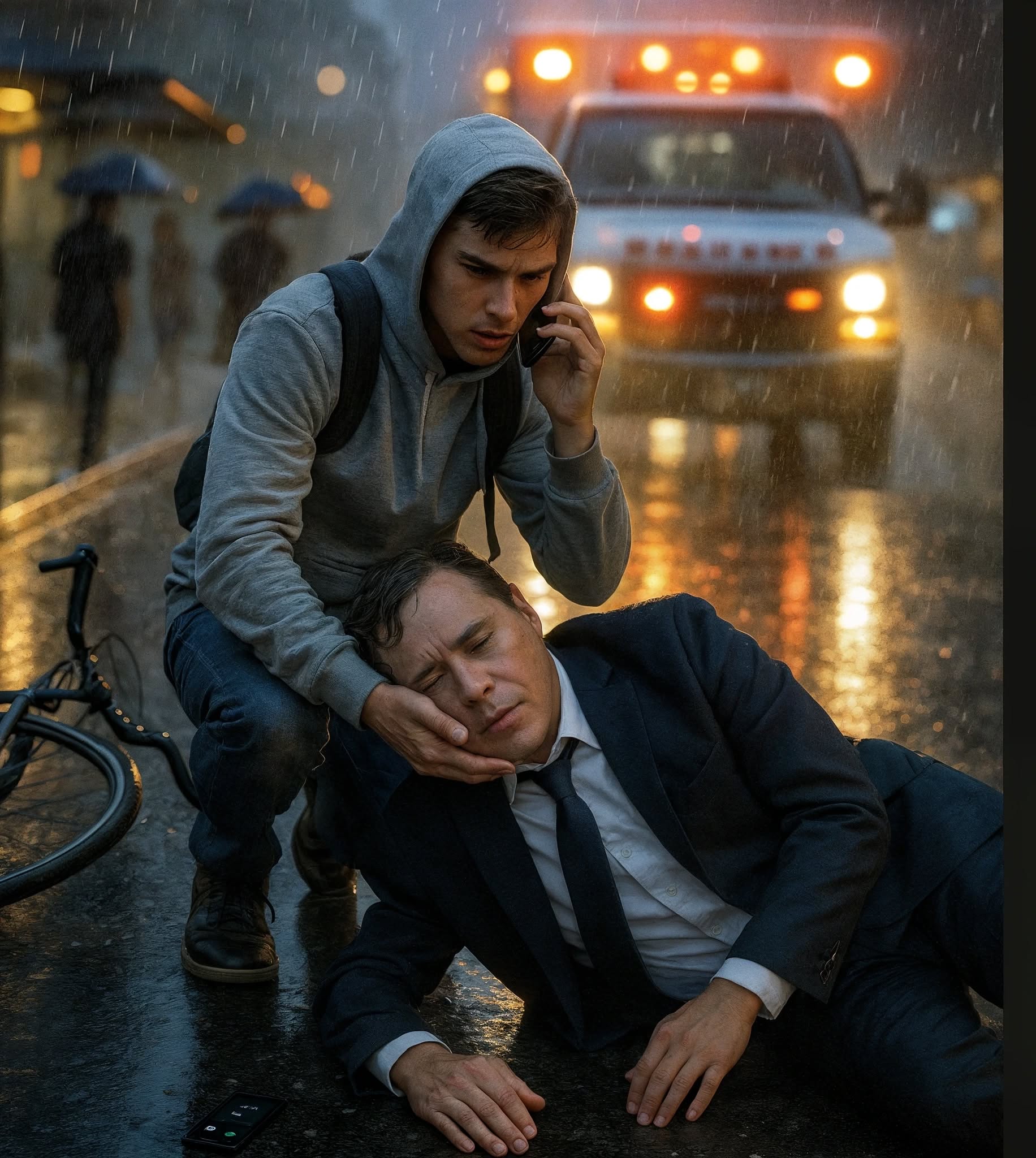 Mężczyzna w granatowym garniturze leżał nieprzytomny w pobliżu przystanku autobusowego, z twarzą zwróconą w stronę chodnika. Spieszący się przechodnie zerkali na niego, a potem szli dalej. Ethan zwolnił – tylko na chwilę – egzamin, jego przyszłość, wszystko ciążyło mu na sercu. Sumienie nie pozwalało mu iść dalej.