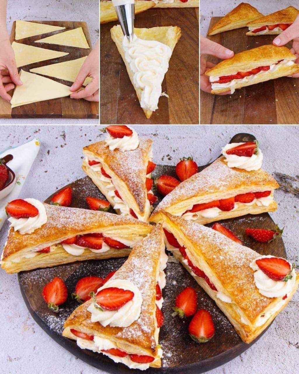 wanilia Pistacje Truskawki Cukier puder PRZYGOTOWANIE: 1. Rozwiń ciasto francuskie na desce do krojenia i pokrój je w trójkąty. Przeczytaj więcej na następnej stronie
