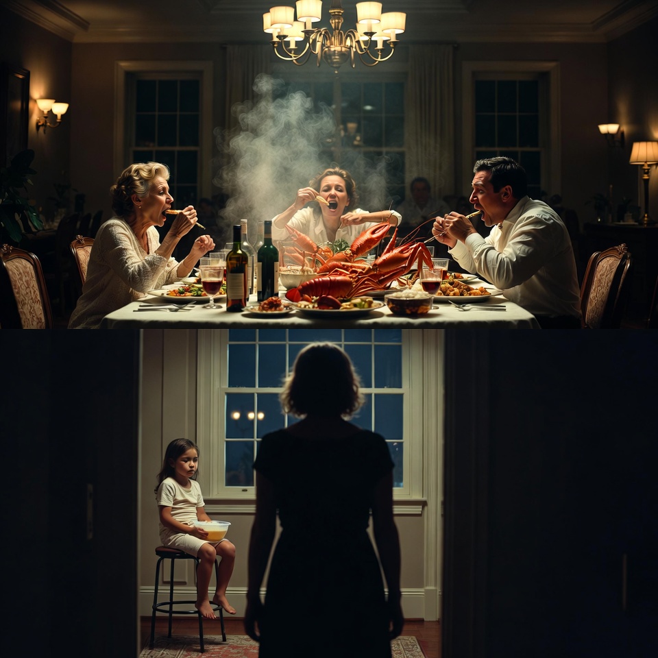 Barbara siedziała na czele stołu, trzaskając pazurem. Frank rozszarpywał ogon homara. Jason nalewał wino, a jego twarz poczerwieniała z rozkoszy.