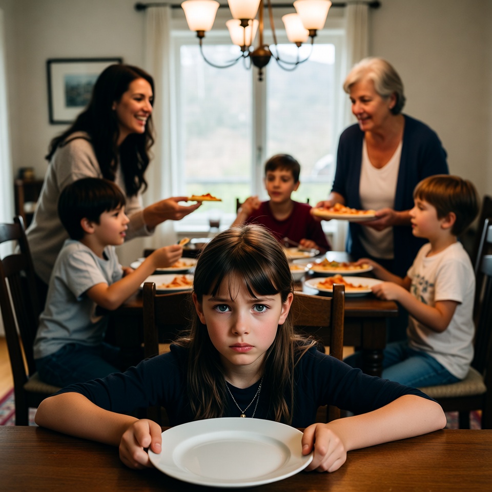 Mia dłubała widelcem w jedzeniu, a jej drobna twarz wyrażała rezygnację. Spojrzała w górę, zerkając na pizzę na głównym stole, a potem z powrotem na swój talerz.