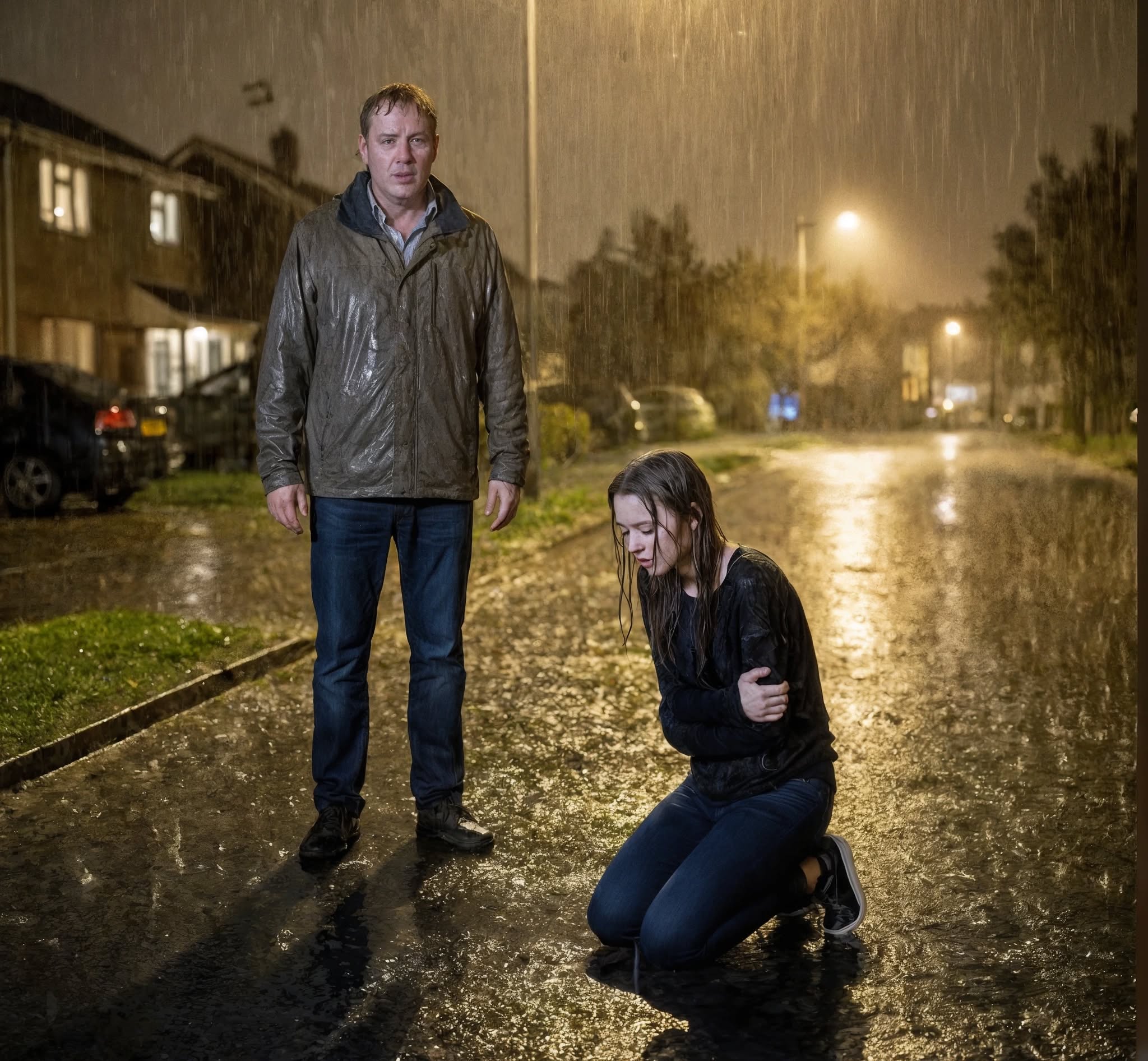 Deszcz padał zimnymi, nieustającymi strugami, gdy skręcałem w ulicę prowadzącą do domu mojej córki. Nie planowałem jej odwiedzać; miałem tylko zostawić paczkę, która omyłkowo została dostarczona pod mój adres. Ale właśnie wtedy zobaczyłem ją – Emily – klęczącą na podjeździe, przemoczoną, drżącą, z dłońmi przyciśniętymi do betonu, jakby zmuszono ją do modlitwy. Woda spływała jej po twarzy, mieszając się ze smugami tuszu do rzęs i przez sekundę myślałem, że upadła. Ale gdy tylko uniosła głowę i drgnęła, wiedziałem.